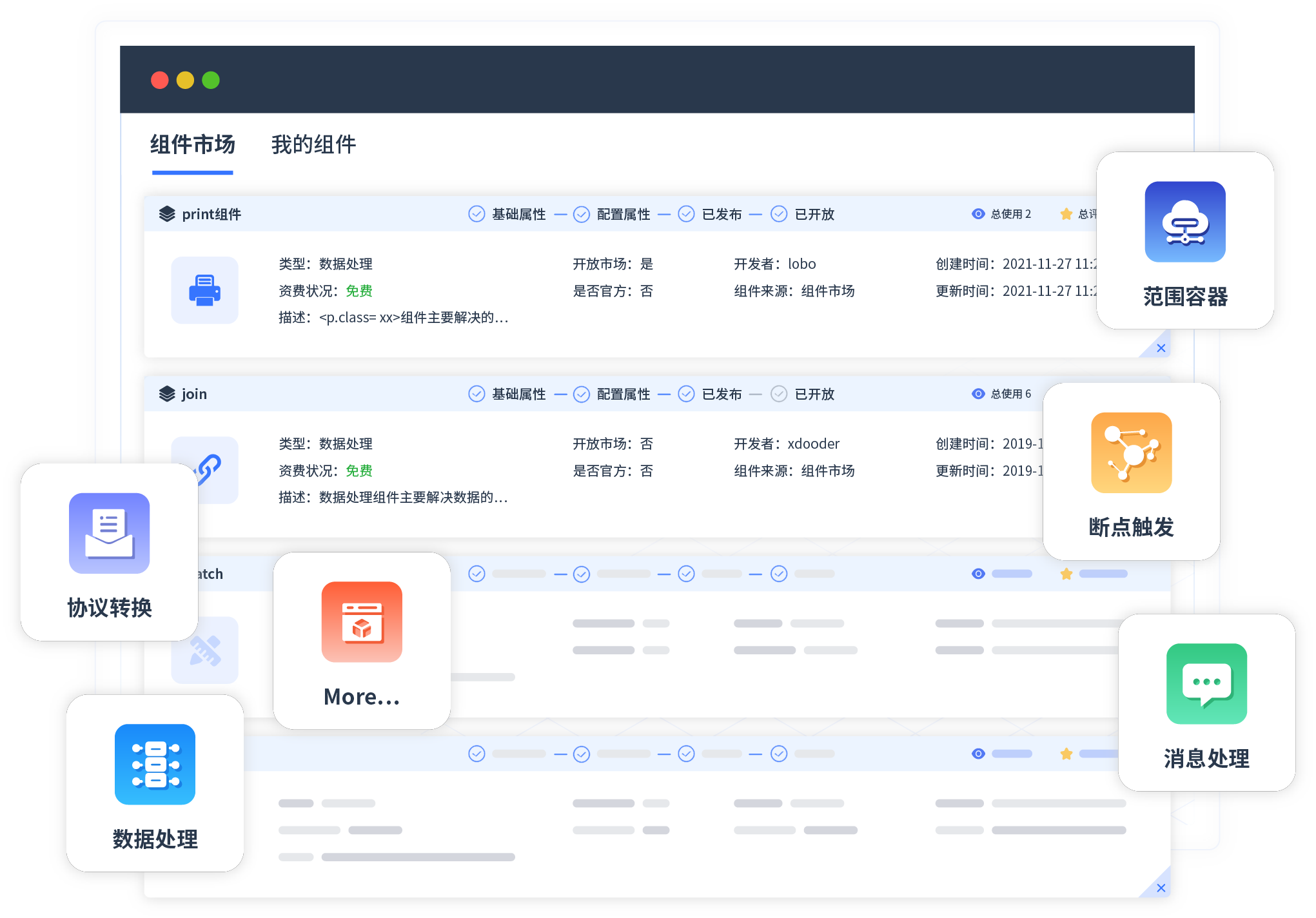 针对集成场景,,钱能钱包提供组件市场,,,,例如协议转换、、、消息处理、、、、文件操作等。。。除平台提供的组件外,,,客户可以自定义所需组件。。