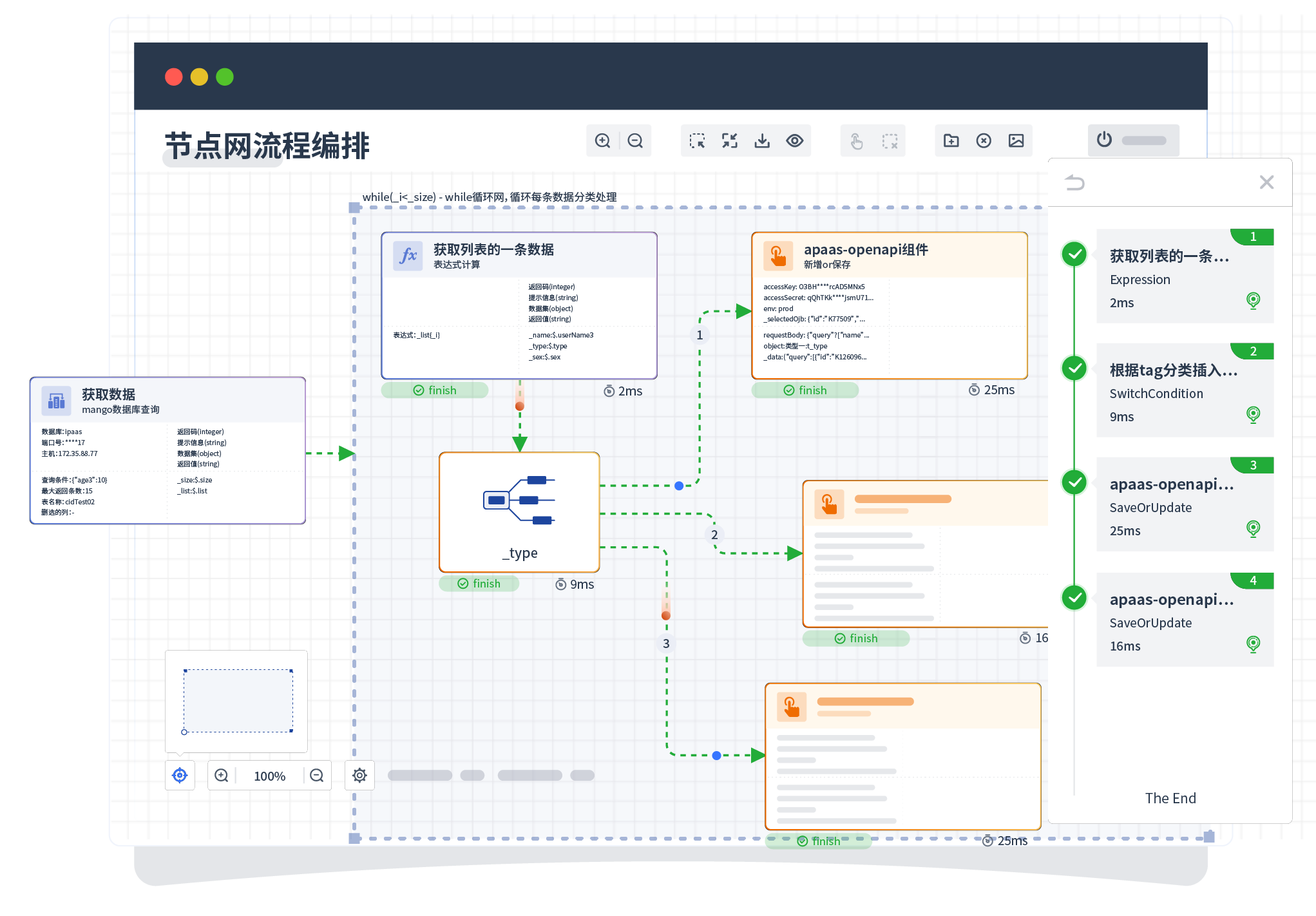 针对集成场景,,,组件定义后支持进行流程编制,,,,不同于传统代码方式,,,,通过图形化展示,,,,支持在线调试、、、、日志查看和运行回放。。