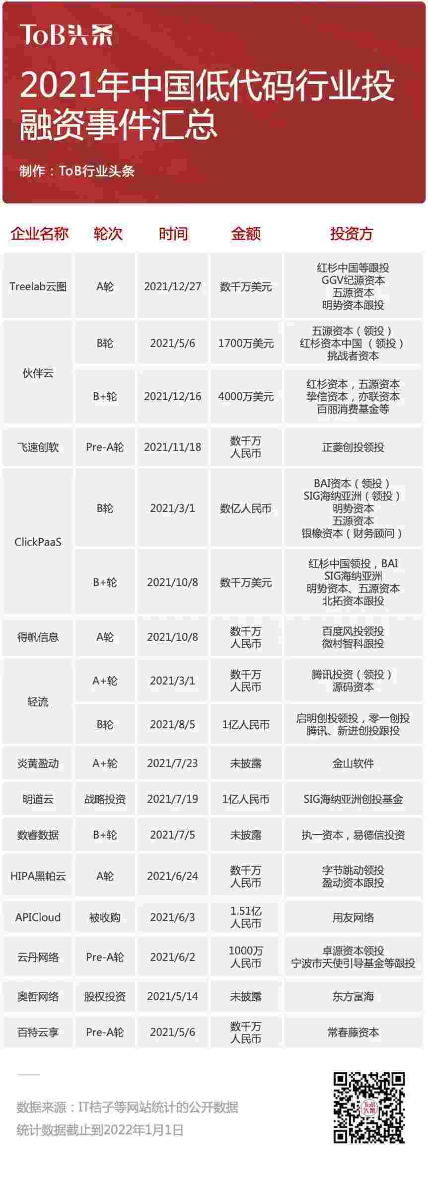 到2021年,,无/低代码投融资规模势头更甚,,其中包括轻流两轮融资(A+轮数千万人民币,,,B轮近亿人民币)、、、钱能钱包 两轮融资(B轮数亿人民币,,,,B+轮数千万美元)、、、百特云享数千万元Pre-A轮融资......